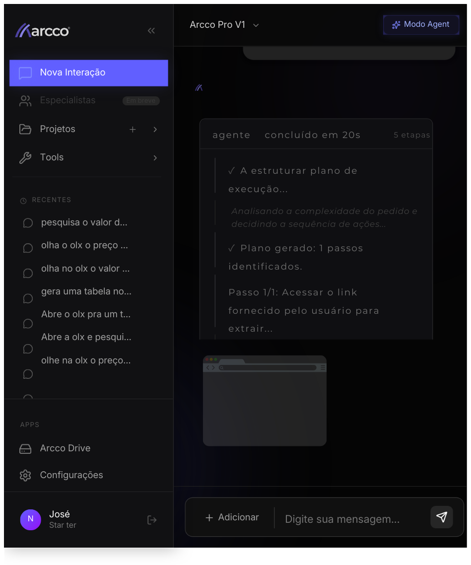 A maioria das IAs gera blocos de texto para você copiar, colar e tentar montar sozinho. A Arcco possui um ambiente de execução real: ele planeja a tarefa, navega na internet, processa planilhas e devolve o arquivo final nas suas mãos. Pare de conversar. Comece a delegar.